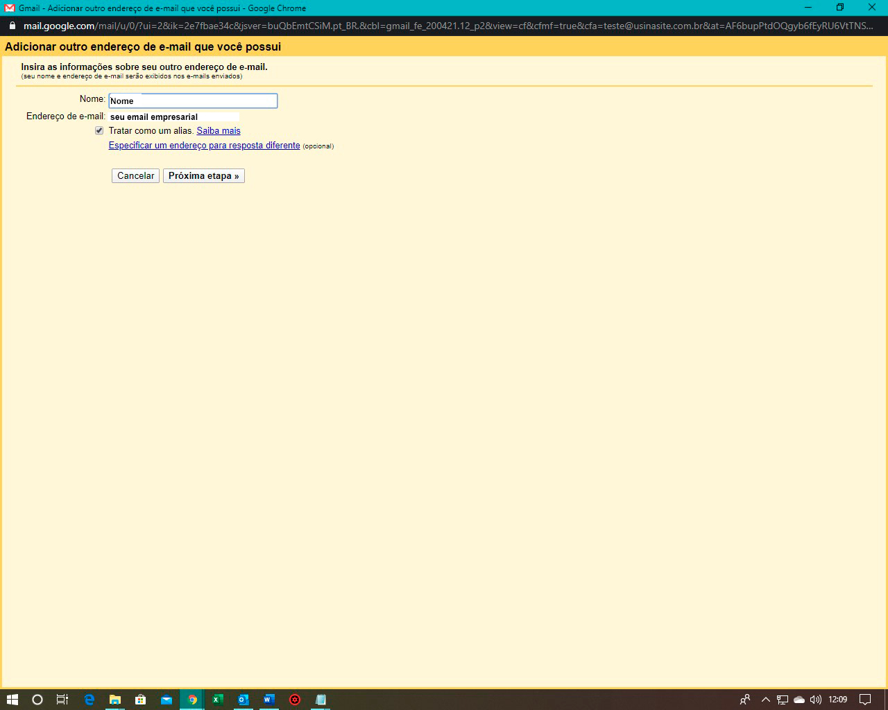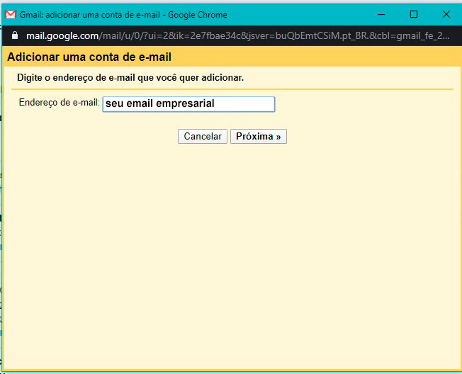 Uma pequena janela do navegador será exibida, onde será inserido a conta de e-mail a ser adicionada. Clique em “Próximo”.
