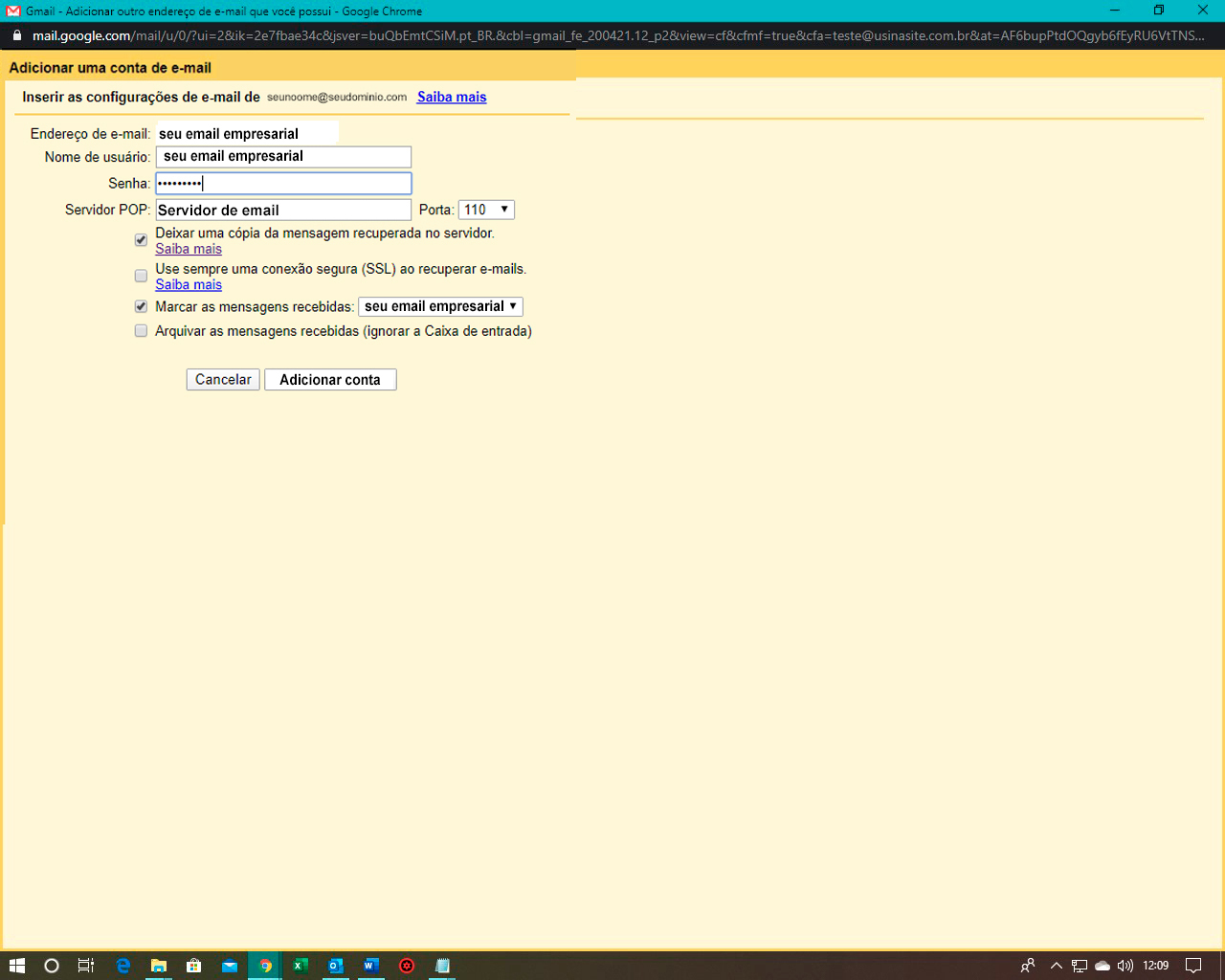 Na próxima janela do navegador preencha o nome do usuário (sua conta) a senha e o servidor de envio de e-mails da conta. Insira a porta correta de recebimento. Clique em “Adicionar conta”.