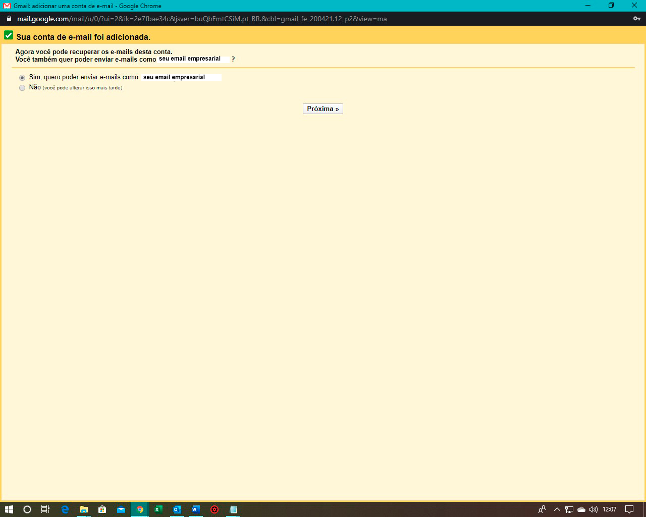 Após a etapa anterior, uma nova janela do navegador será aberta. Marque “Sim” para enviar e-mails de sua conta externa. Clique em “Próximo”.