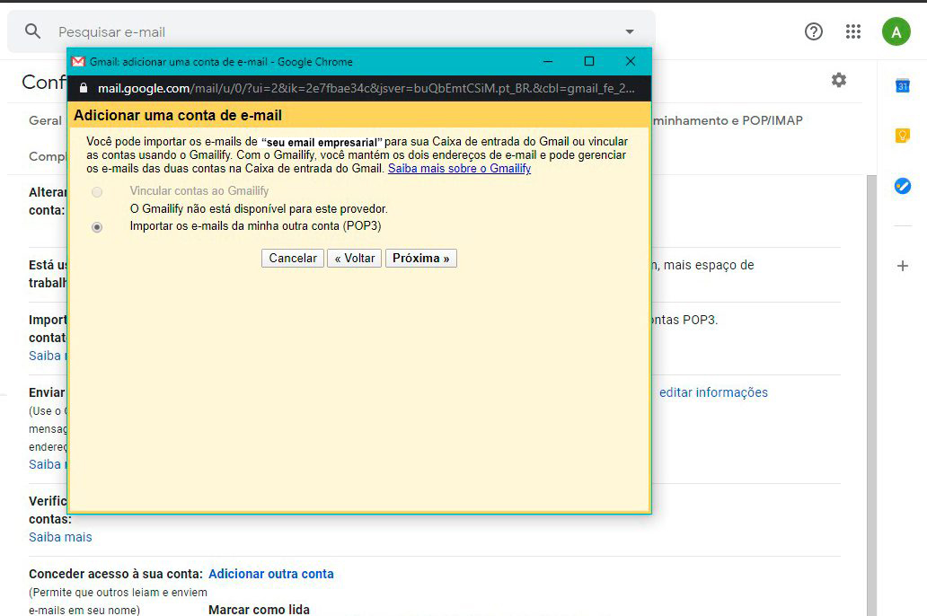 Uma pequena janela do navegador será exibida novamente, onde será marcada a opção “Importar os e-mails da minha outra conta (POP3)”. Clique em “Próximo”.
