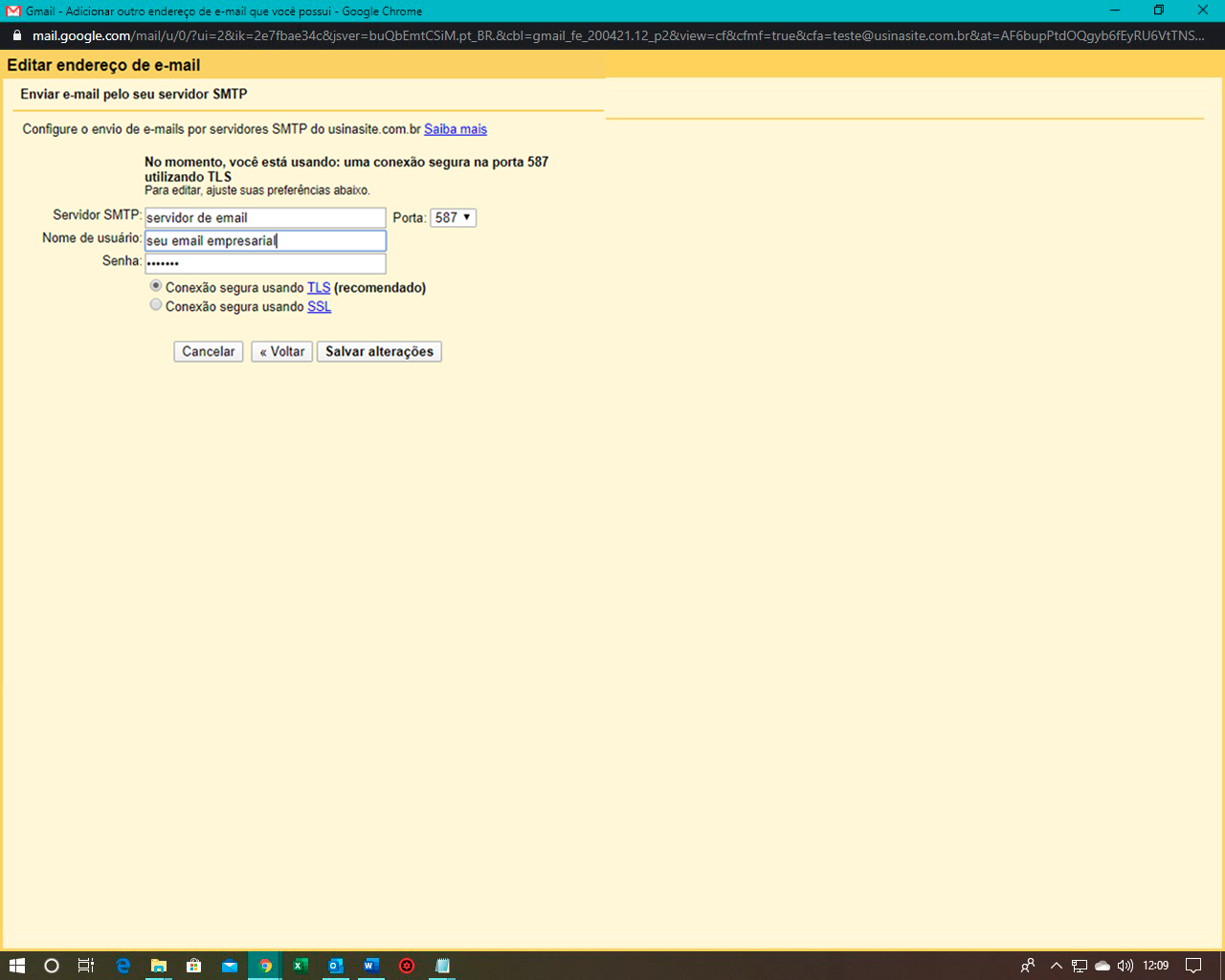 Na nova janela do navegador coloque o servidor SMTP, o nome da conta e a senha, utilizando a porta correta. Clique em “Adicionar conta”.