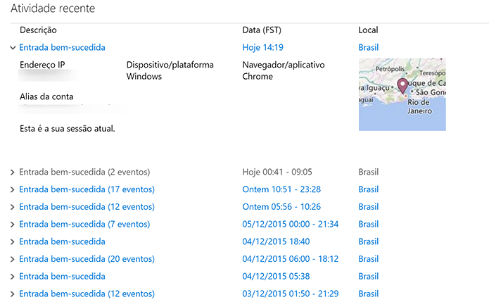 Se você desconfia que usou um computador infectado ou há alguém conectado à sua conta, um bom passo é acessar o histórico de logins. No Outlook ou Hotmail, basta acessar “account.live.com” e fazer o login na página. Em seguida, clique na aba “Segurança e privacidade”, seguido por “Ver minhas atividades Recentes”.