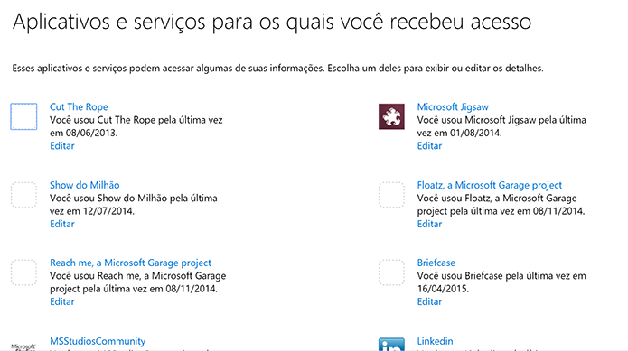 Diversos aplicativos da web e de celulares contam com conexões às contas do Google e da Microsoft, o que pode apresentar riscos de uso mal intencionado. Para verificar as conexões ao seu Outlook, volte a “account.live.com”, clique em “Segurança e Privacidade” e, por fim, em “Gerenciar permissões” em “Aplicativos e serviços”. Para excluir algum item da lista, toque em editar e em “Remover essas permissões”.