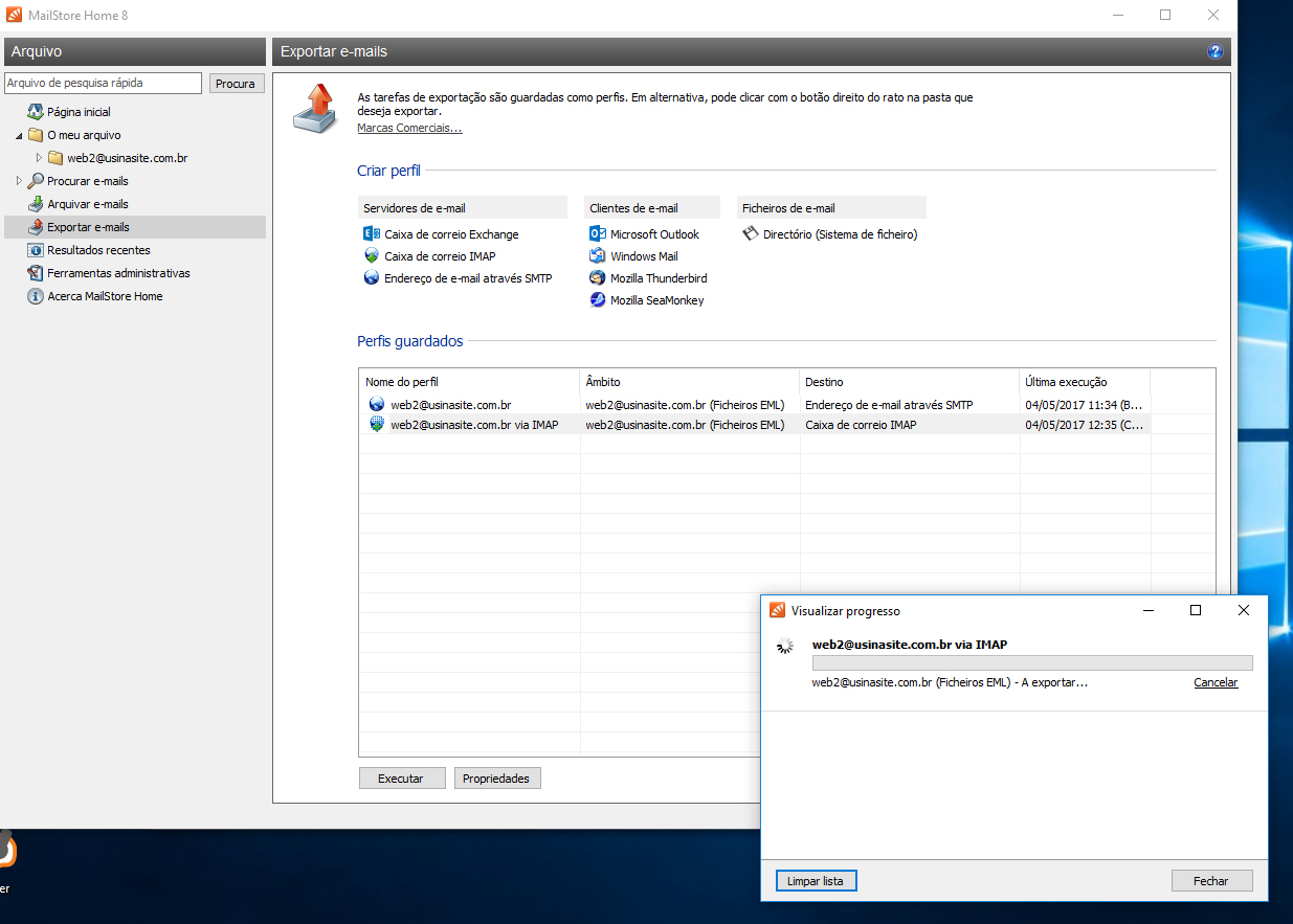 Clique duas vezes sobre a pasta com o nome do seu email. Abrirá uma janela onde mostrará o avanço da exportação.