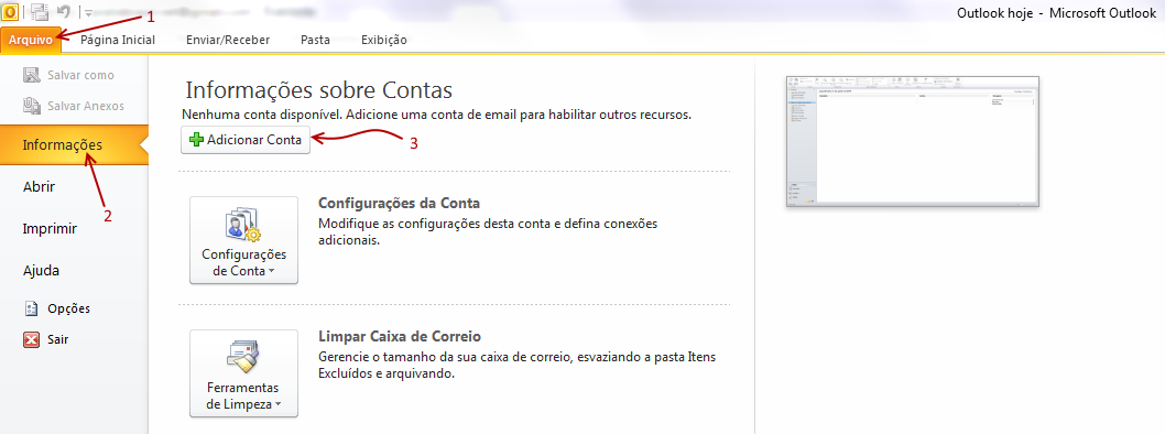 Clique no menu Arquivo(1), selecione Informações(2) e clique no botão + Adicionar Conta(3).