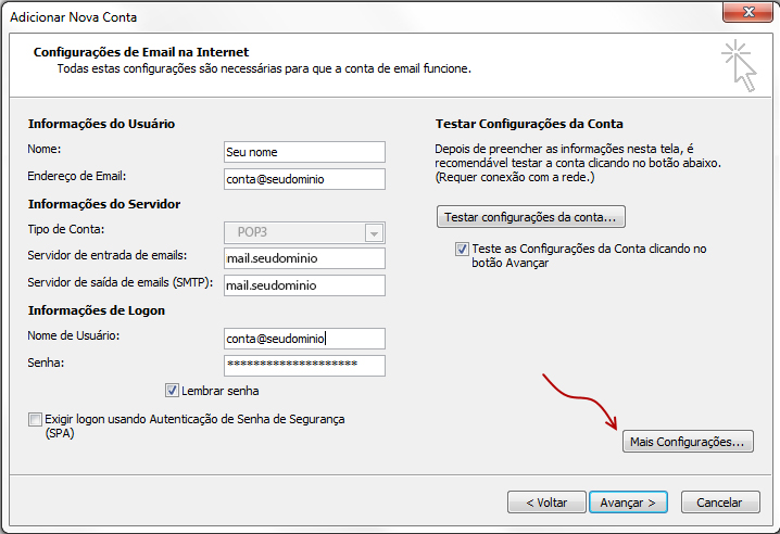 Endereço de Email: seu email completo Ex: email@seudominio.com.br