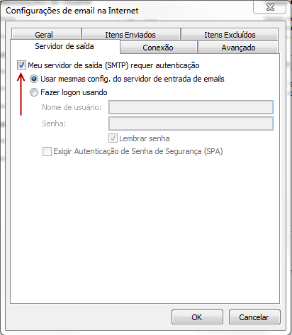 Na nova janela, selecione a aba Servidor de saída. Deixe marcada a opção Meu servidor de saída (SMTP) requer autenticação, também deixe marcada a opção Usar mesmas configurações do servidor de entrada de emails.
